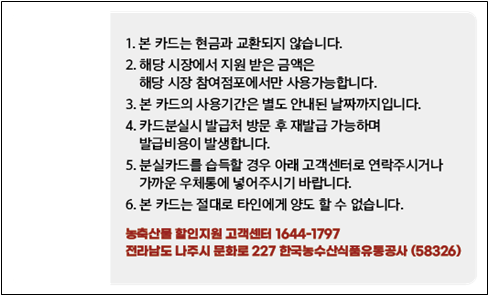 예를 들어, 2만원을 충전하면 추가 4천원이 자동으로 더해져 총 24,000원으로 농축산물을 구매할 수 있죠. 카드 충전은 5천원 단위로 가능하며 2주 간 최대 2만원까지 충전 가능합니다.