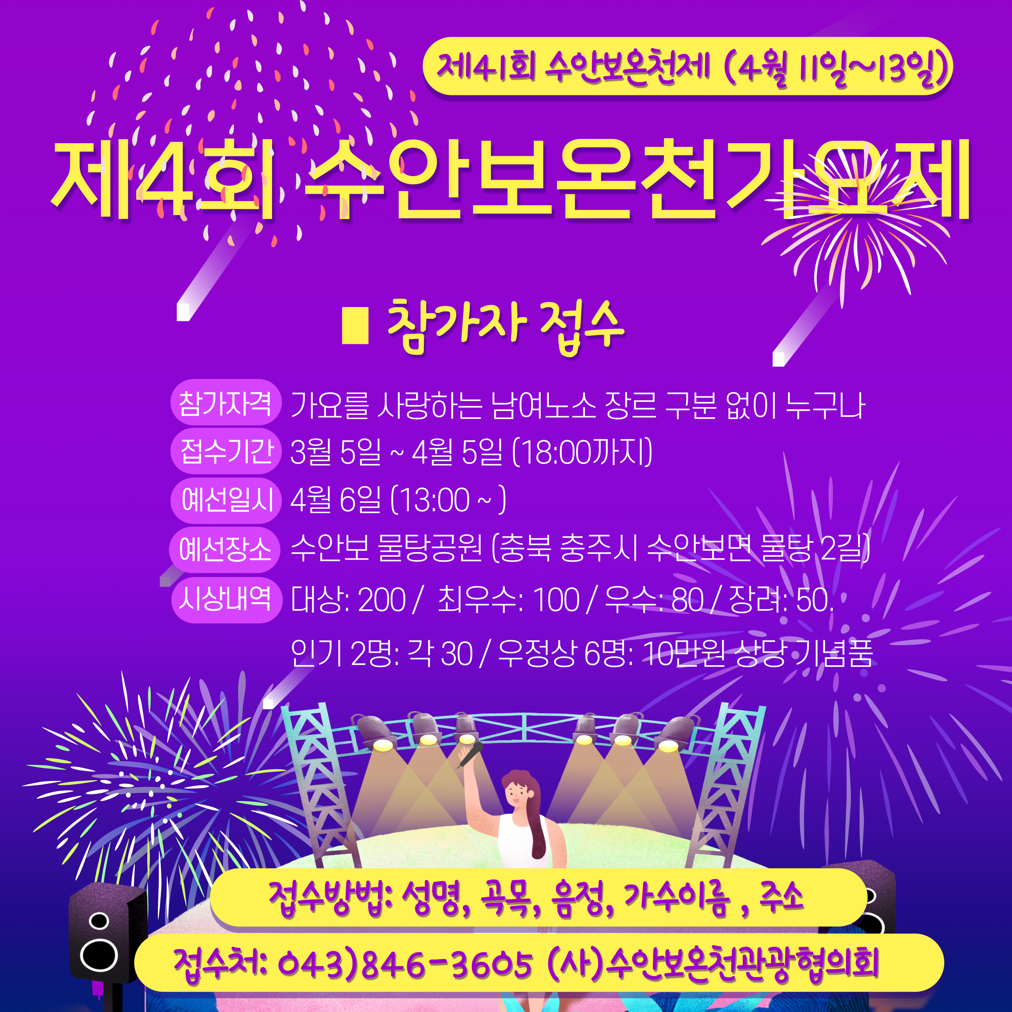 - 수안보 온천 가요제: 참가자들이 노래 실력을 뽐낼 수 있는 무대로, 예선은 4월 6일 오후 1시부터 수안보 물탕공원에서 진행됩니다. 참가 신청은 4월 5일까지이며, 접수처는 043-846-3605입니다.