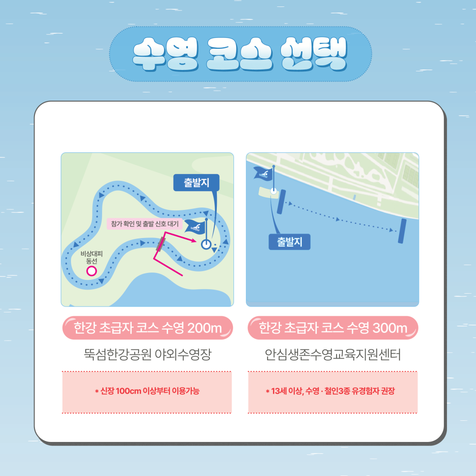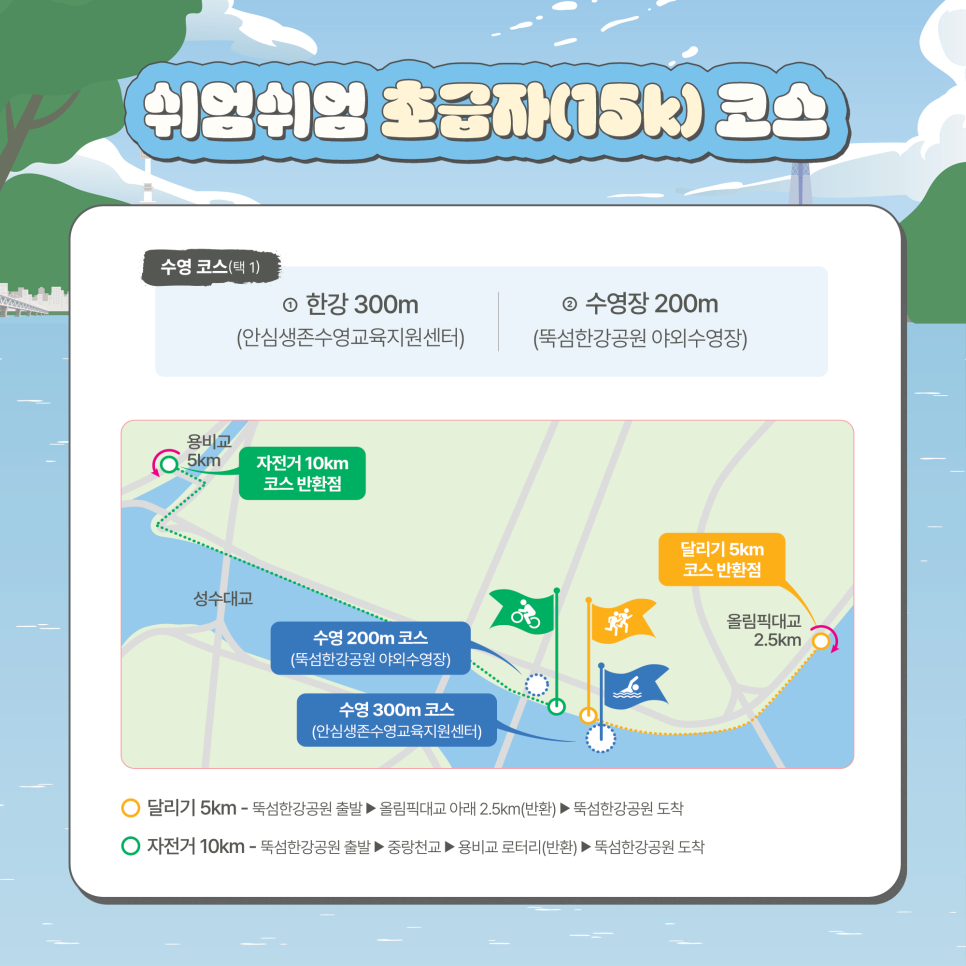 - 코스 선택: 참가자는 자신의 체력 수준에 따라 초급자1, 초급자2, 상급자 코스를 선택할 수 있습니다.