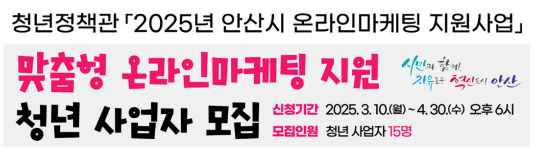안산시에서 청년 사업자들의 온라인 매출 경쟁력을 높이기 위한 맞춤형 온라인마케팅 지원사업 참여자를 모집하고 있습니다. 주요 내용을 정리하면 다음과 같습니다.