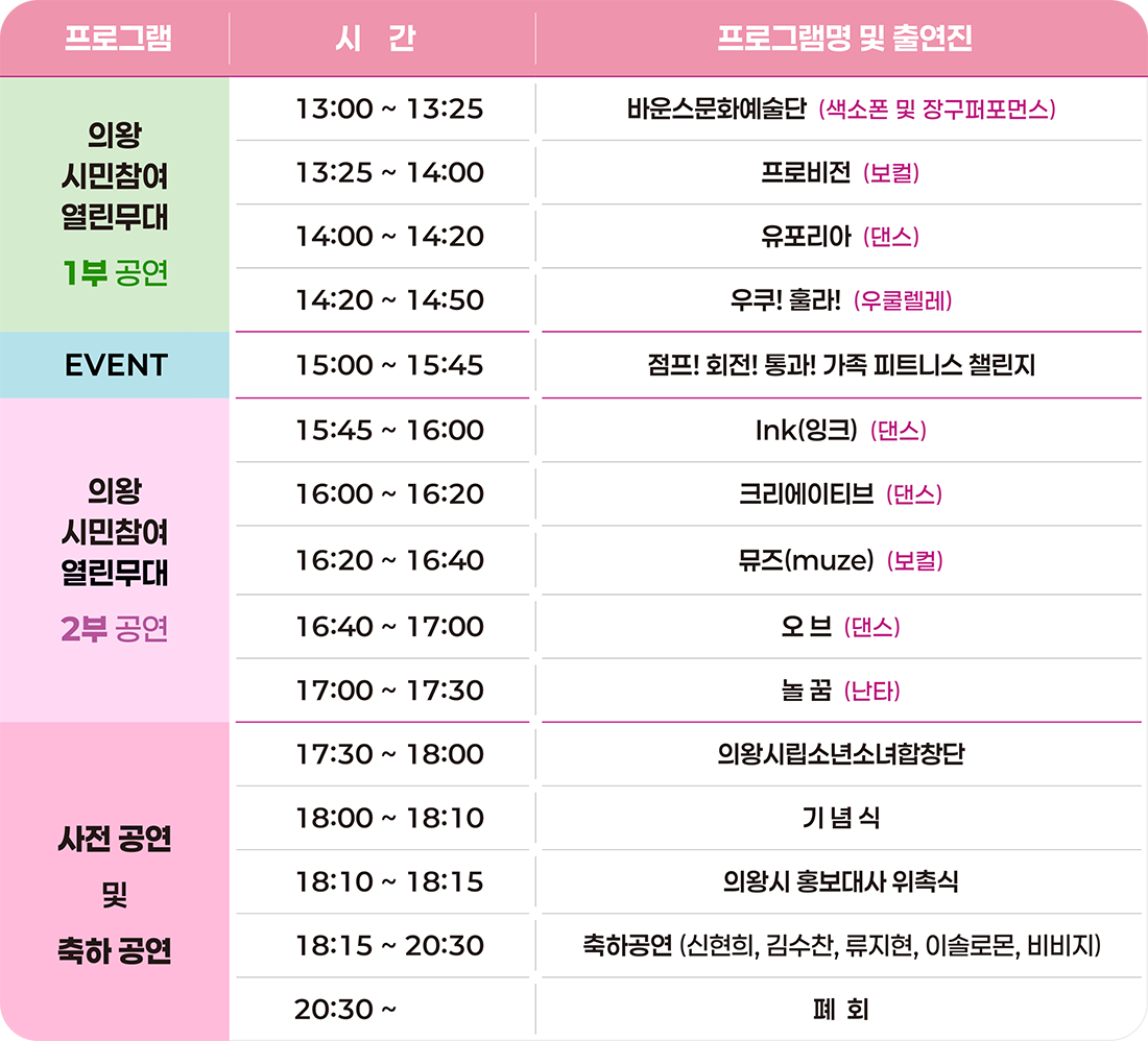 | 18:00~20:00 | 축하공연 (비비지, 이솔로몬 등) | 메인 무대 |
