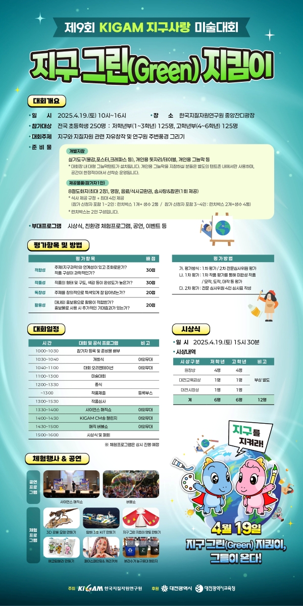 한국지질자원연구원이 주최하는 ‘지구사랑 미술대회’는 올해로 9회를 맞이하며, 매년 지구의 날(4월 22일)을 기념해 열립니다.
