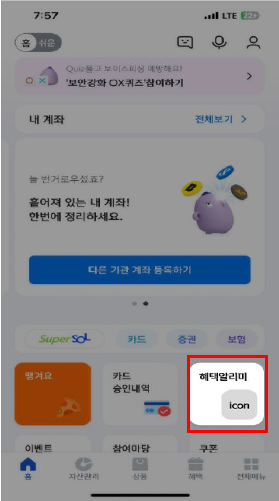 현재'혜택알리미' 서비스는 기업은행과 신한은행의 모바일 애플리케이션을 통해 시범 운영 중입니다. 각 은행 앱에서 '혜택알리미' 서비스를 찾아 가입하신 후, 개인정보 제공에 동의하시면 맞춤형 혜택 안내를 받을 수 있습니다.