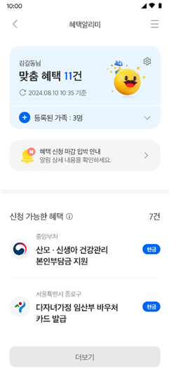 - 맞춤형 혜택 추천 : 출산, 실직 등 개인의 상황 변화에 따라 관련된 정부 혜택을 자동으로 안내합니다.
