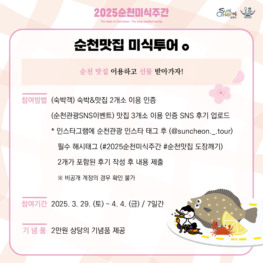 - 맛집 도장깨기: 순천의 다양한 맛집을 방문하고 스탬프를 모아 선물을 받을 수 있는 이벤트로, 온·오프라인에서 동시에 진행됩니다.
