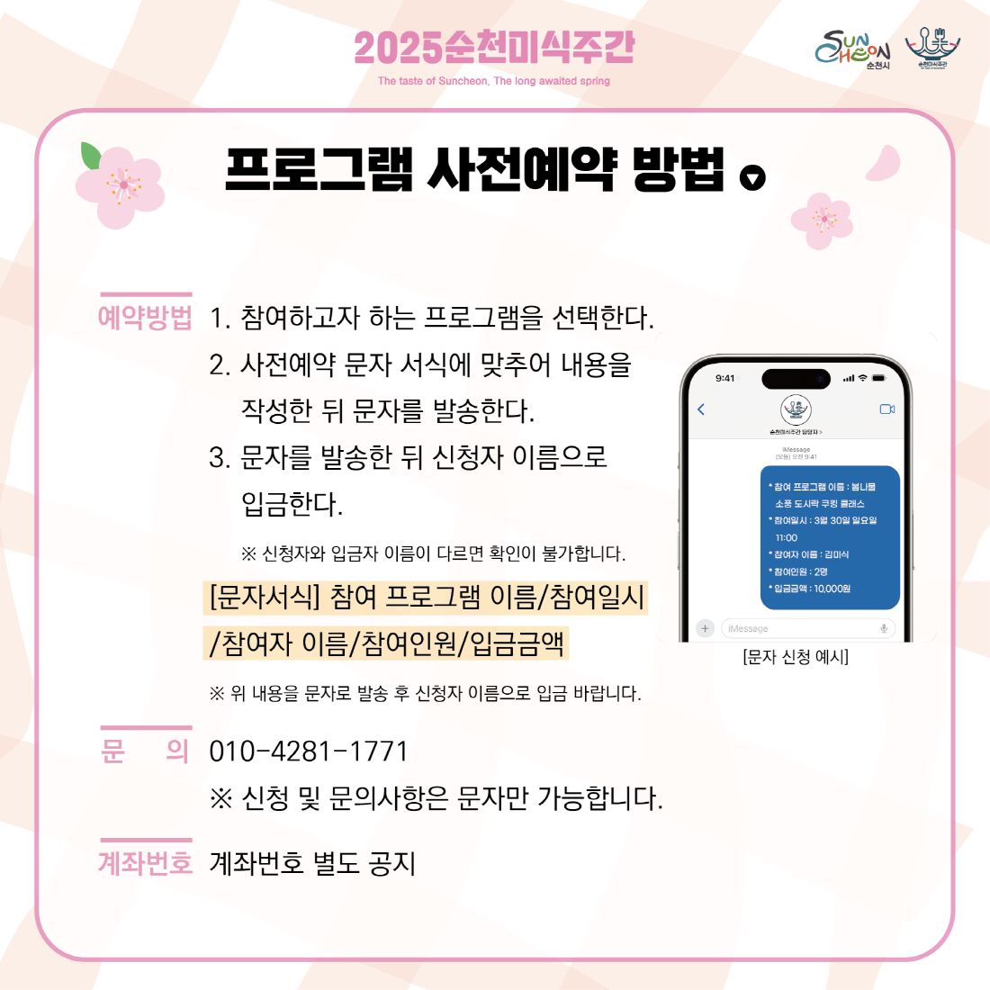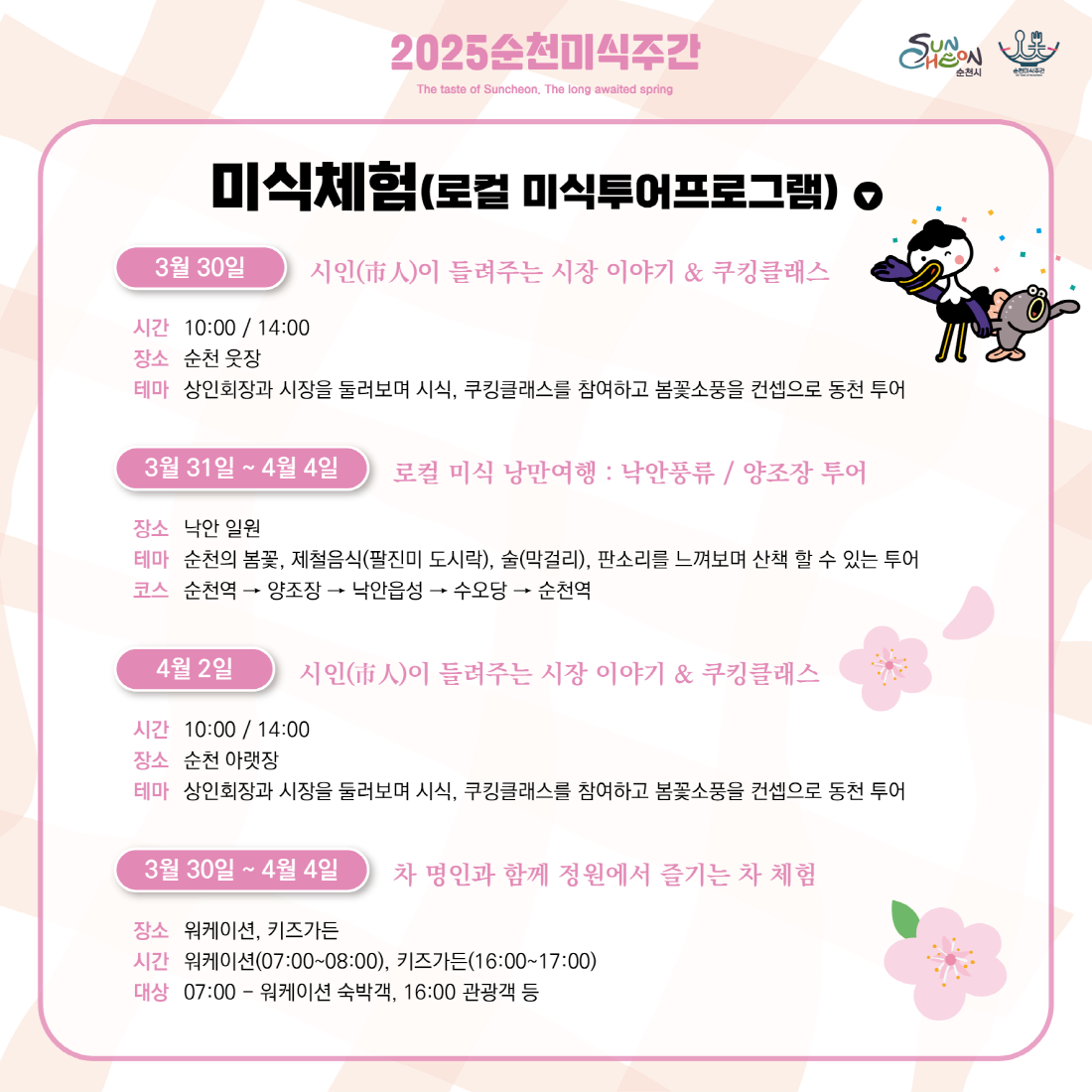 순천미식주간은 순천의 아름다운 봄 풍경과 함께 다양한 미식 체험을 즐길 수 있는 특별한 기회입니다.가족, 친구, 연인과 함께 순천의 맛과 멋을 만끽해보시길 바랍니다.