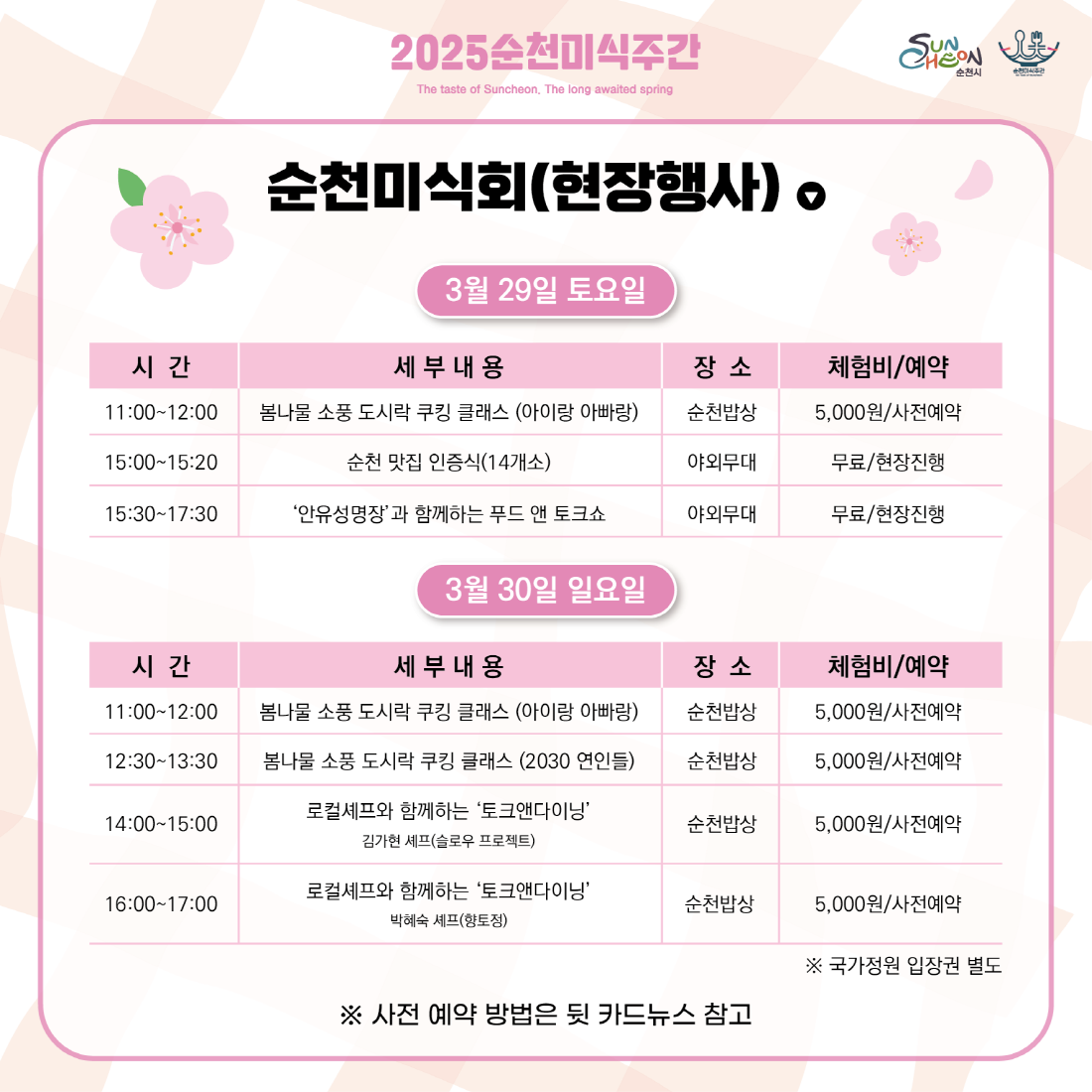 - 현장 행사:3월 29일과 30일, 순천만 국가정원 스페이스 허브에서 열리며, 순천 맛집 인증식, 유명 셰프와의 미식 워크숍 및 푸드쇼, 지역 셰프와 함께하는 봄 푸드 다이닝, 음식거리 테마 음식 전시관, 미식 마켓 및 체험 존 등이 운영됩니다.