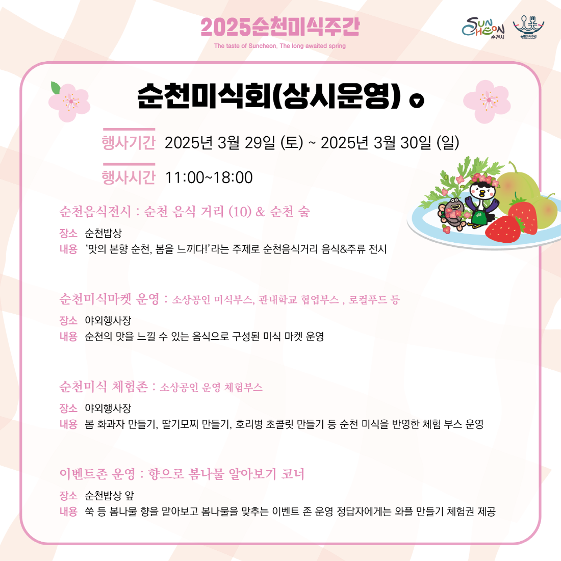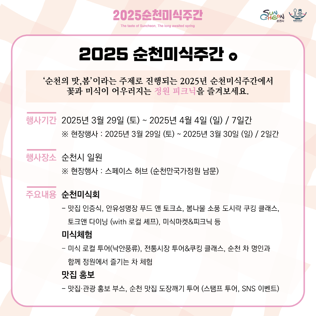 2025년 순천미식주간은 '순천의 맛, 봄'을 주제로 3월 29일(토)부터 4월 4일(금)까지 전라남도 순천시에서 개최됩니다.