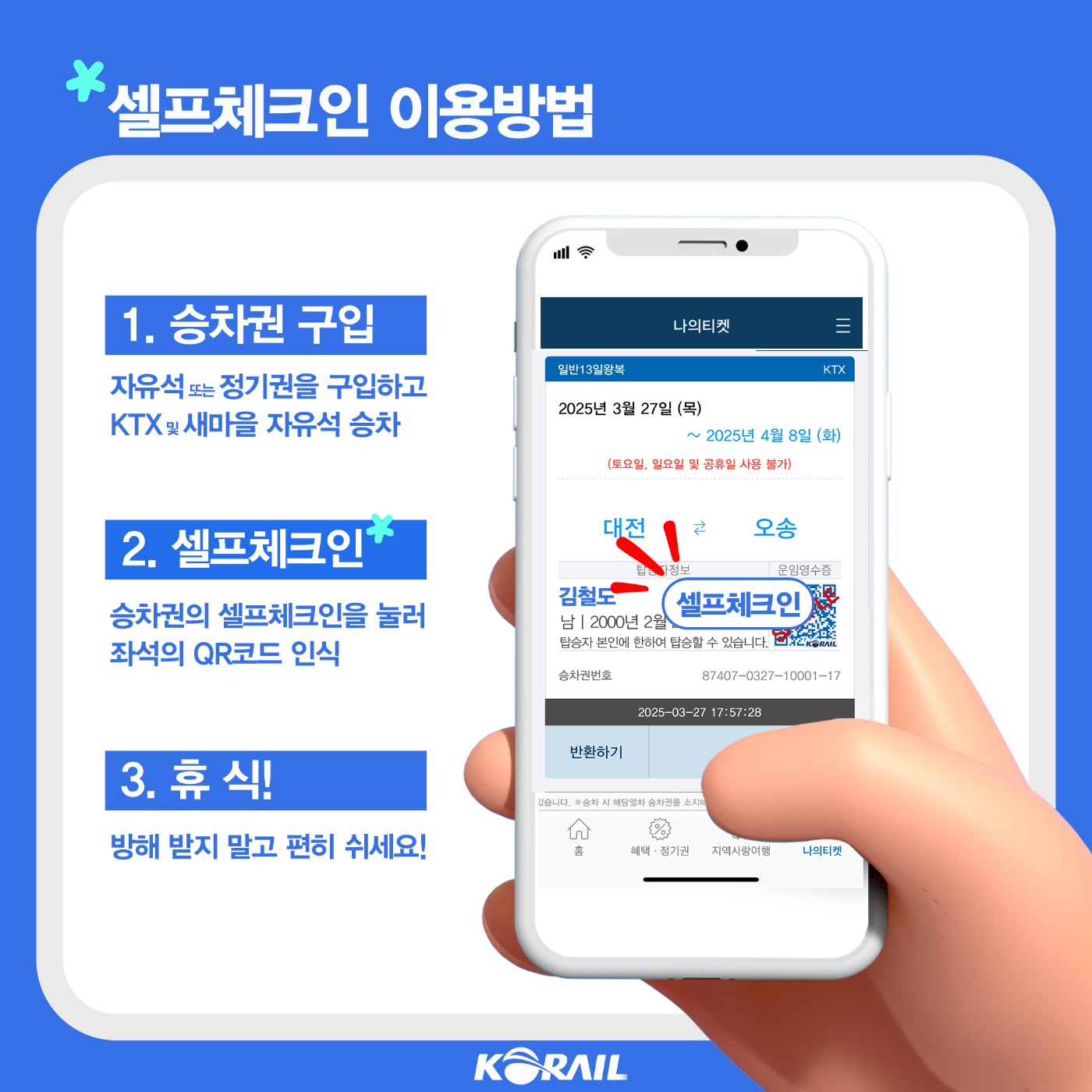 한국철도공사(코레일)는 KTX와 ITX-새마을 자유석 이용 고객을 대상으로 ‘셀프체크인 경품 이벤트’를 4월 7일부터 5월 7일까지 진행합니다.